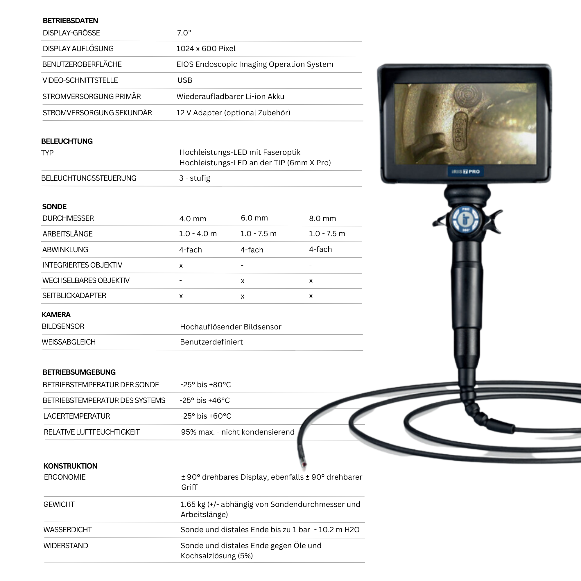 Inspektionen in abgelegenen oder unzugänglichen Bereichen der rauen Industrie-Umgebungen sind jetzt in kürzester Zeit und mit einer ungeahnten Leichtigkeit realisierbar. Das System ist innerhalb von Sekunden einsatzbereit. Sie können das distale Ende schnell, einfach und präzise in jede gewünschte Position bringen. Mit Hilfe der bewährten taktilen Steuereinheit kann die Sondenspitze bis zu 180° abgewinkelt werden. Die starke LED-Lichtquelle stellt sicher, dass Sie keine Details auf dem 7“ Touch Display mit hoher Auflösung verpassen. Die integrierte, austauschbare und wiederaufladbare Hochleistungsbatterien gewährleisten eine Betriebsdauer von 2 Stunden.