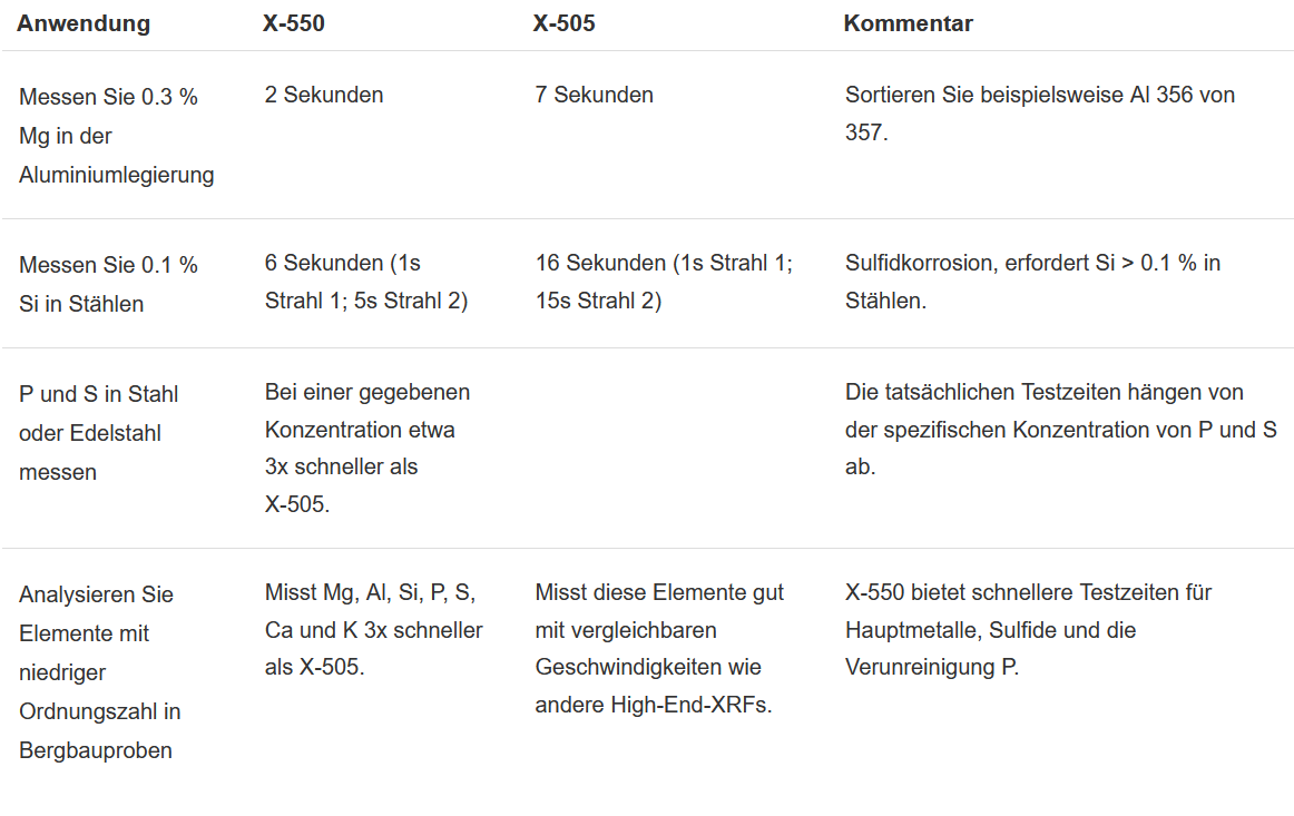 Was ist der Unterschied zwischen dem Premiummodell X-550 und dem Arbeitstier X-505? Die Antwort ist einfach: Geschwindigkeit bei Elementen mit niedriger Ordnungszahl wie Mg, Al, Si, P und S.