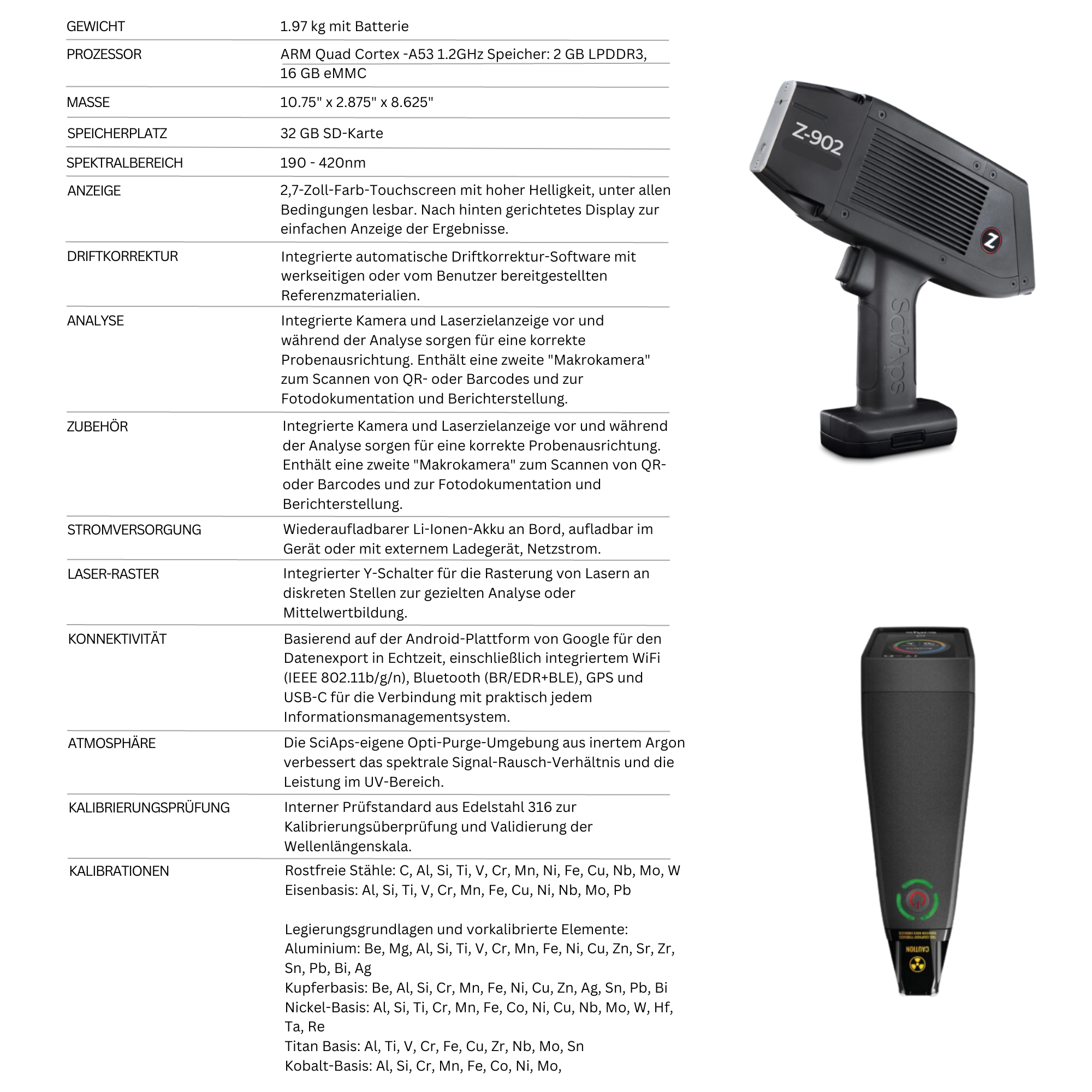 Der Analysator nutzt zwei Spektrometer, um den Wellenlängenbereich auf 190 – 620 nm zu erweitern. Das Instrument ist werkseitig für eine Reihe von 15 bis 20 Elementen kalibriert, je nach Anwendung. Oder Bediener können das zugehörige Profile Builder-Softwarepaket verwenden, um die Anpassung an bestimmte Elemente, ihre eigenen Kalibrierungsstandards und die Spektralverarbeitung vorzunehmen. Der Z-902+ kann so eingerichtet werden, dass er die Emissionen jedes beliebigen Elements misst . Zu den gängigen werkseitig kalibrierten Z-902+-Anwendungen gehören Legierungen und Aluminium.