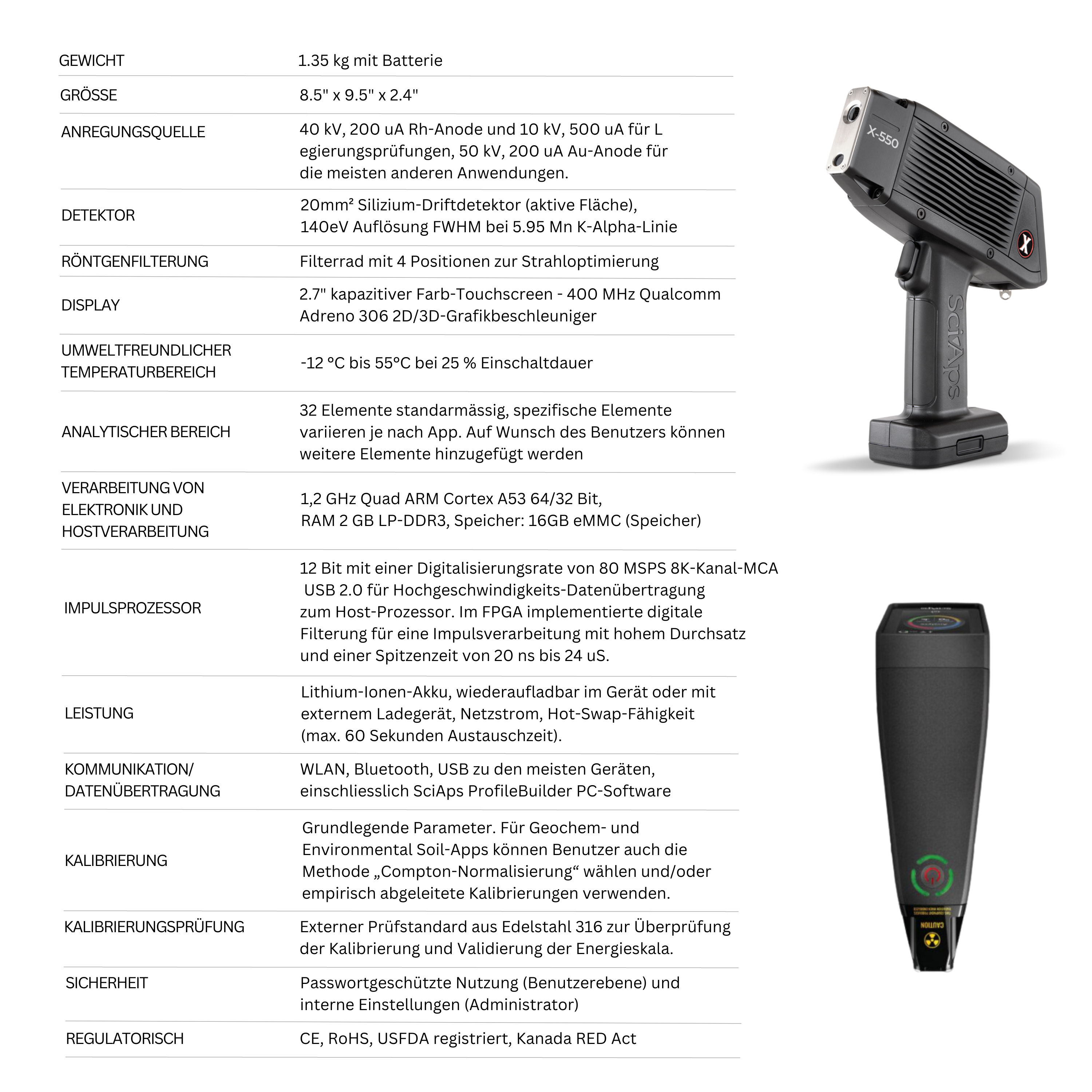 Das SciAps X-550 setzt einen neuen Leistungsstandard für tragbare RFA-Geräte. Mit einem Gewicht von 1,3 kg mit Batterie ist es die leichteste, schnellste und beweglichste Röntgenpistole, die je hergestellt wurde. Es bietet die geringe Größe, die enorme Geschwindigkeit und die hohe Präzision der X-Serie in einem perfekt ausbalancierten Gerät. Es ist schnell bei allen Legierungen, einschließlich Aluminium.