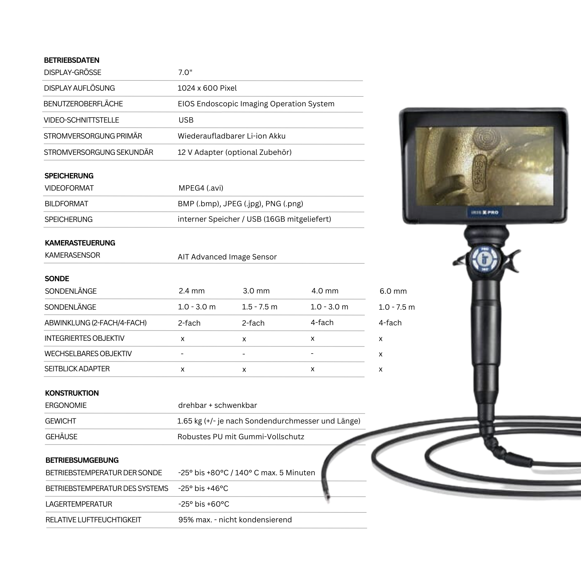 Inspektionen in abgelegenen oder unzugänglichen Bereichen der rauen Industrie-Umgebungen sind jetzt in kürzester Zeit und mit einer ungeahnten Leichtigkeit realisierbar. Das System ist innerhalb von Sekunden einsatzbereit. Sie können das distale Ende schnell, einfach und präzise in jede gewünschte Position bringen. Mit Hilfe der bewährten taktilen Steuereinheit kann die Sondenspitze bis zu 180° abgewinkelt werden. Die iRIS X PRO steht für sehr kontrastreiche Bildaufnahmen. Die starke LED-Lichtquelle stellt sicher, dass Sie keine Details auf dem 7“ Touch Display mit hoher Auflösung verpassen. Die integrierte, austauschbare und wiederaufladbare Hochleistungsbatterien gewährleisten eine Betriebsdauer von 2 Stunden.