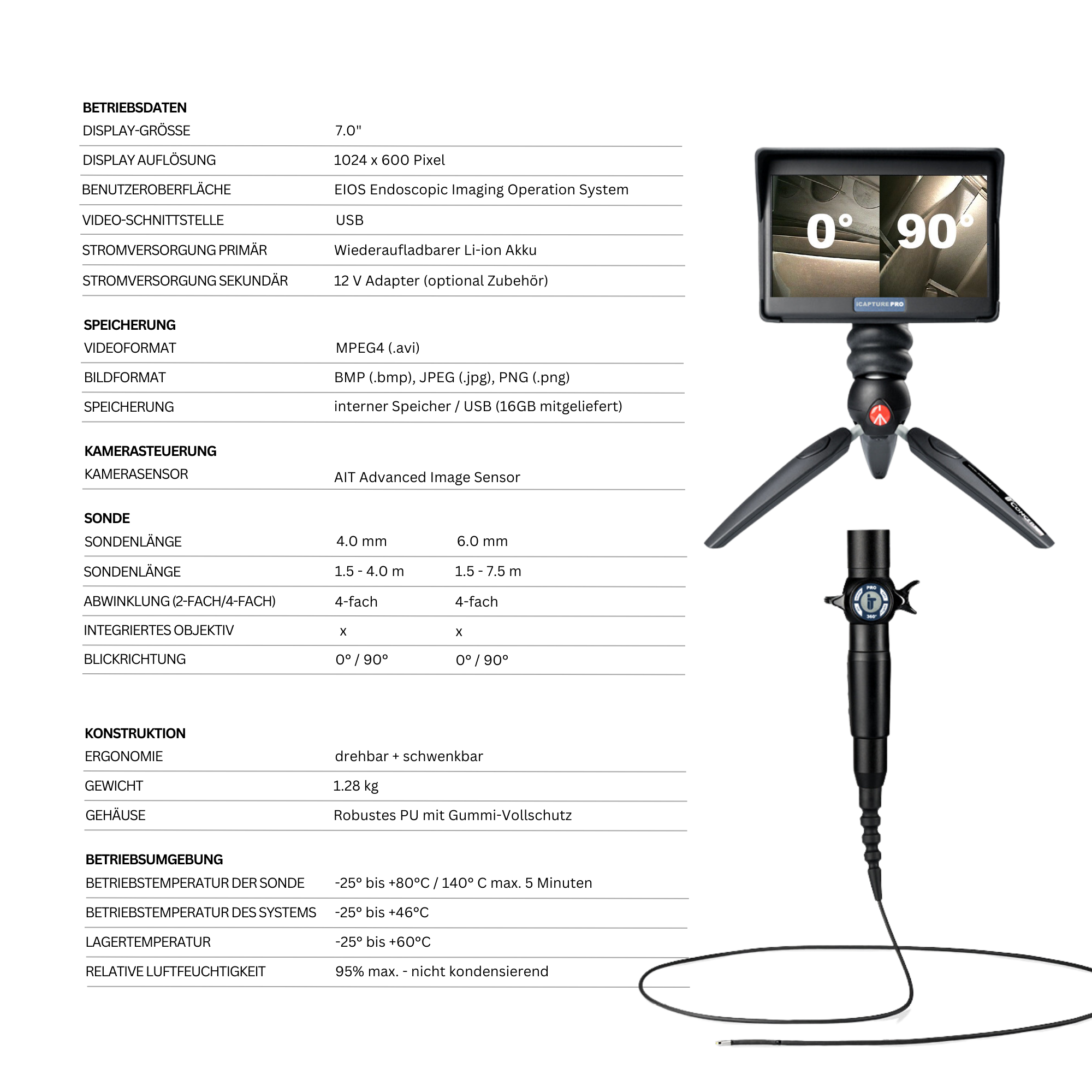 Das System ist innerhalb von Sekunden einsatzbereit. Sie können das distale Ende schnell, einfach und präzise in jede gewünschte Position bringen. Mit Hilfe der bewährten taktilen Steuereinheit kann die Sondenspitze bis zu 180° abgewinkelt werden. Die starke LED-Lichtquelle stellt sicher, dass Sie keine Details auf dem 7“ Touch Display mit hoher Auflösung verpassen. Die integrierte, austauschbare und wiederaufladbare Hochleistungsbatterien gewährleisten eine Betriebsdauer von mehr als 2 Stunden.